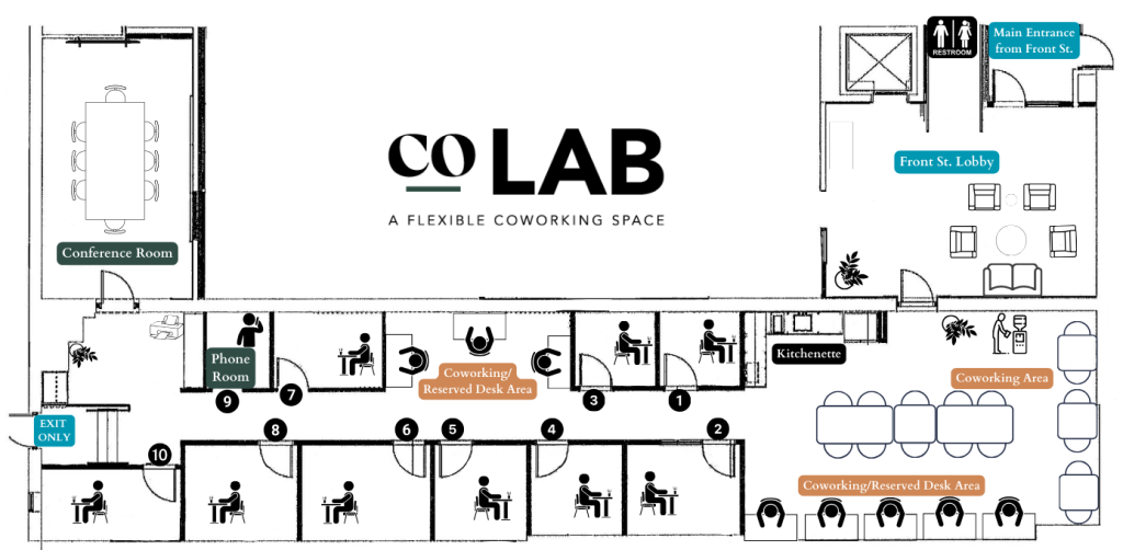 High Speed WiFi throughout CoLAB. Professional and Micro Offices include Ethernet connections.